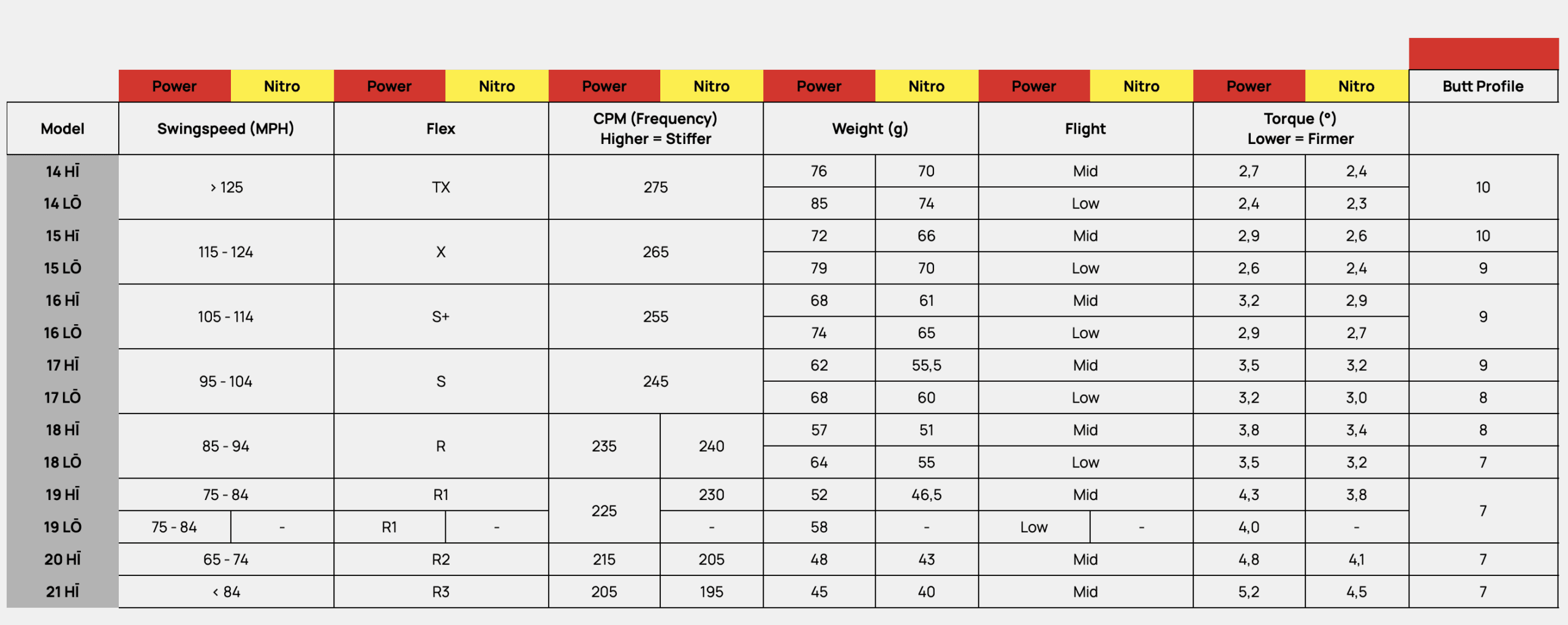 Hi mallit on suunniteltu tuottamaan korkeampaa lyöntikaarta ja Lo mallit matalampaa kaarta.